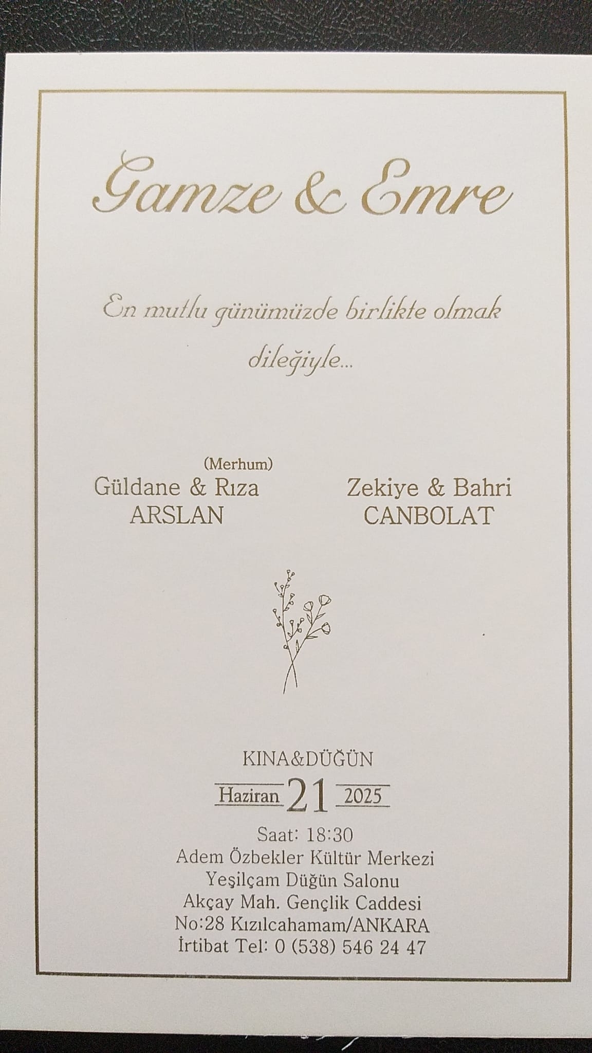 DÜĞÜNE DAVET:Bahri & Zekiye Canbolat'ın oğlu Emre Canbolat ile Gamze Arslan'ın kına & düğününe tüm köylülerimiz davetlidir.Tarih: 21 Haziran 2025 Cumartesi Saat: 18.30Yer: Kızılcahamam Adem Özbekler Düğün Salonu İletişim: 0 541 156 40 41 (Bahri Canbolat)